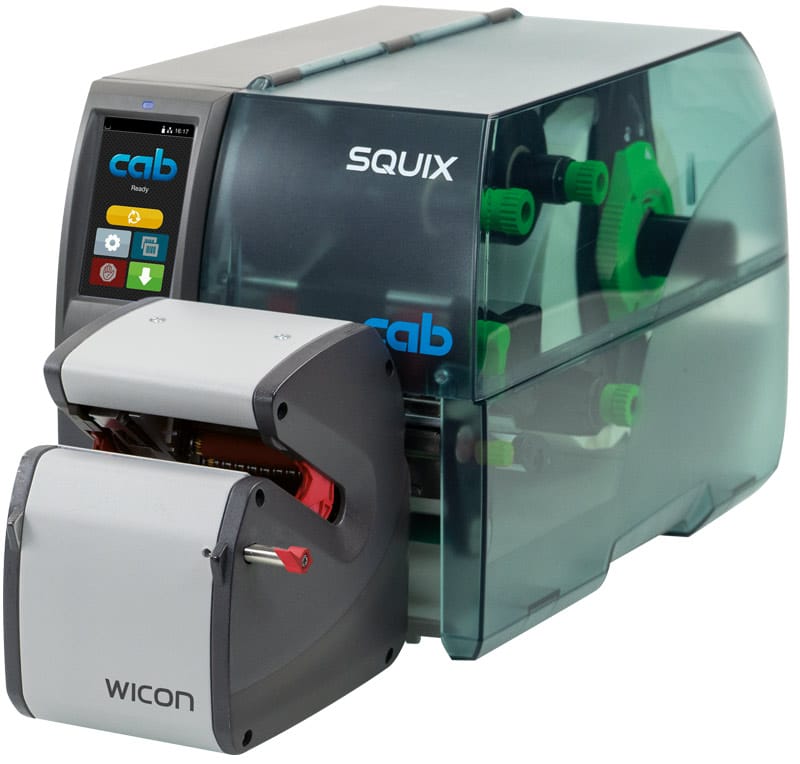 Wrap applicator for Cab Squix 4/300MP, article 5977007 for cable labelling of cylindrical objects with diameters from 2 mm to 16 mm, such as wires, conductors, cables, hoses, tubes and round bars. The labels are applied with a transparent laminate that covers the label and provides durable protection against dust and wear.