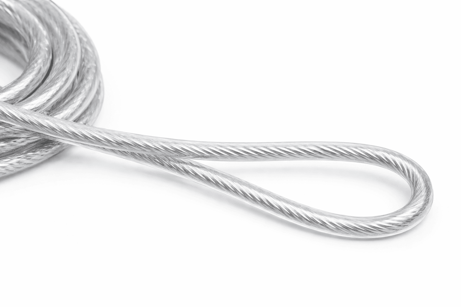 Inplastad stålvajer med stålkärna och slitstark plastbeläggning som skyddar mot nötning och yttre påverkan.