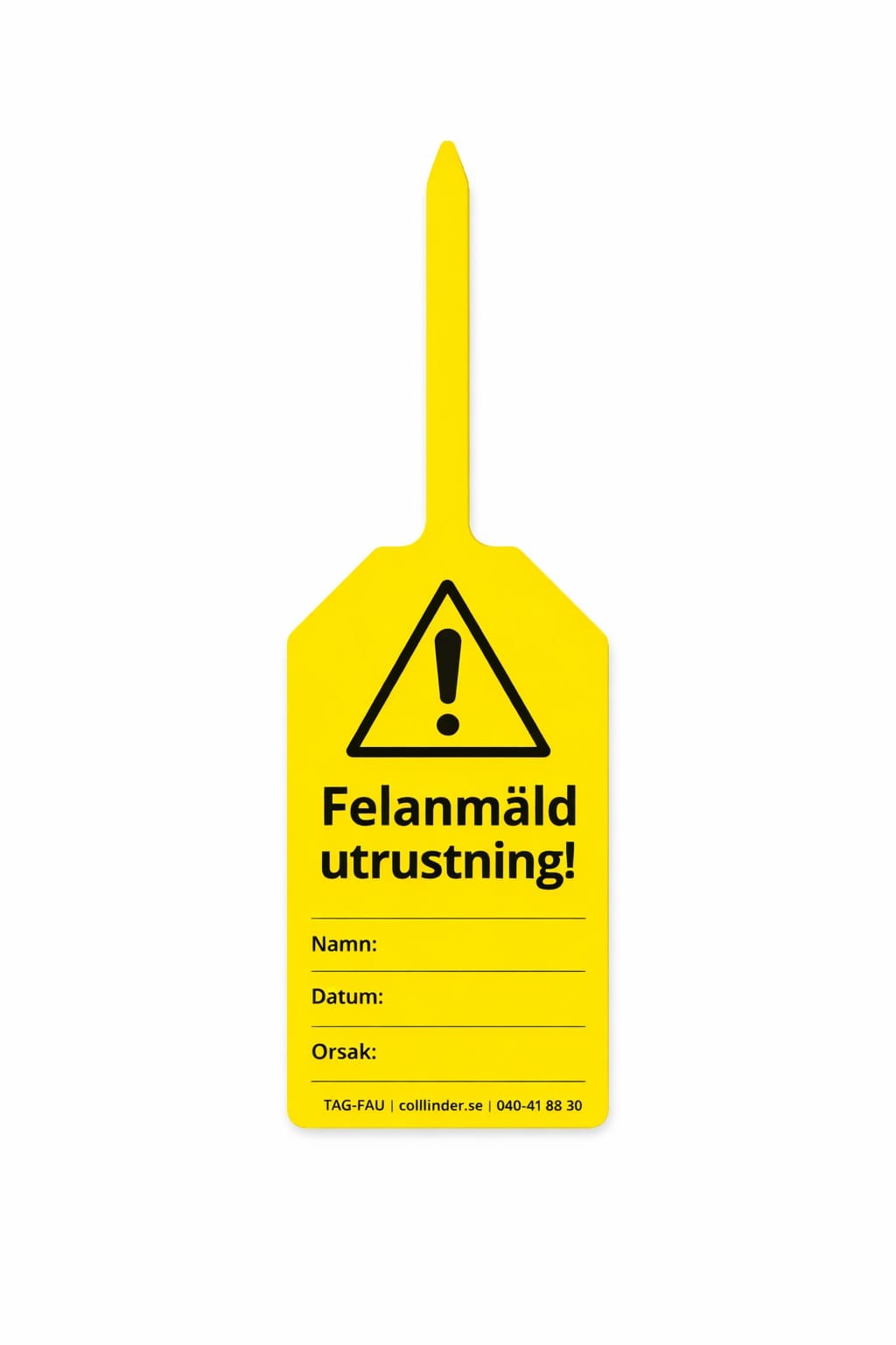 Självlåsande tagoutskylt för uppmärkning av avvikelser i produktion, till exempel felanmäld utrustning eller detaljer som behöver åtgärdas.
