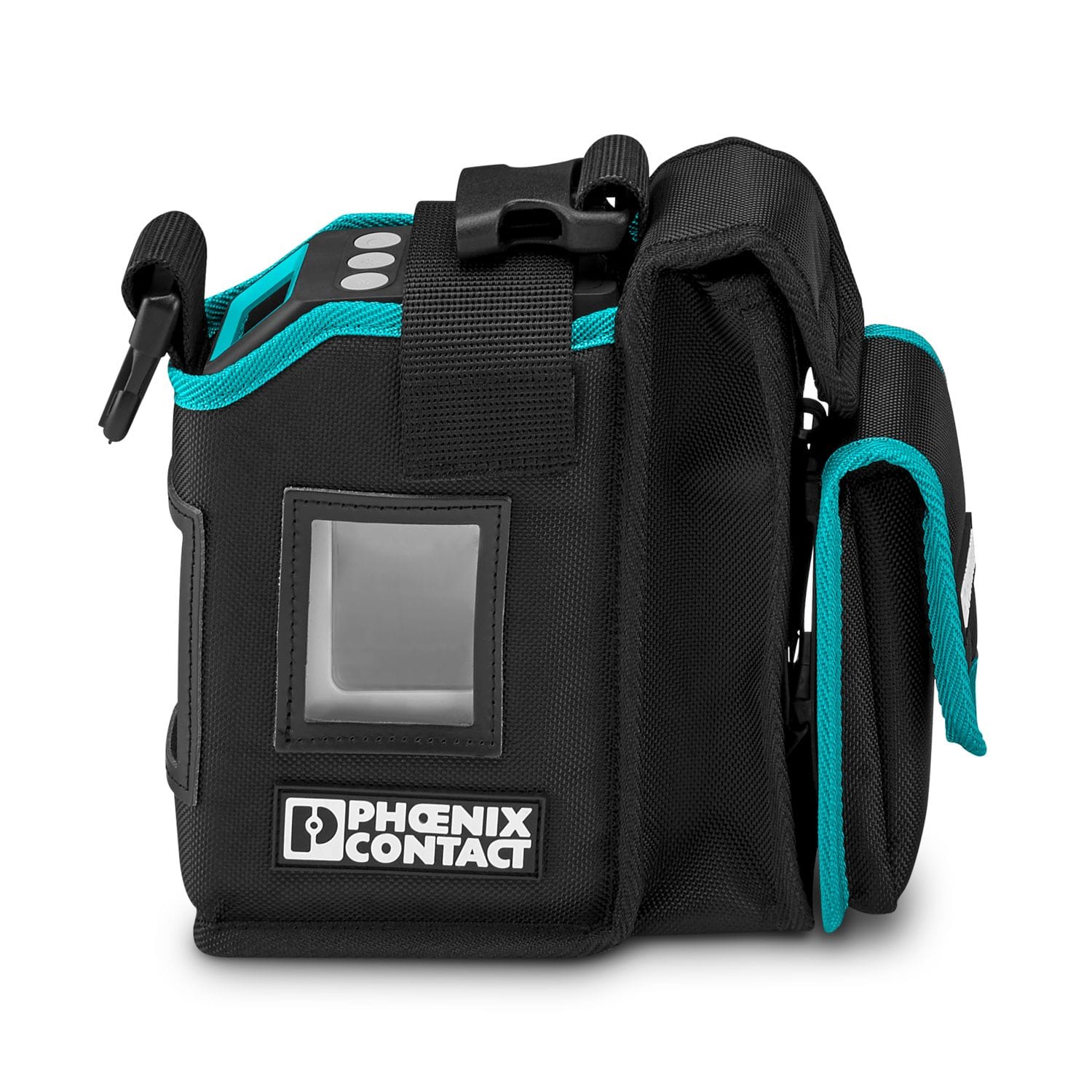 Den avtagbara smartphone-väskan kan även fästas separat i bältet vid behov. Remmar i de enskilda facken gör det enkelt att ta ur både skrivare och tillbehör.